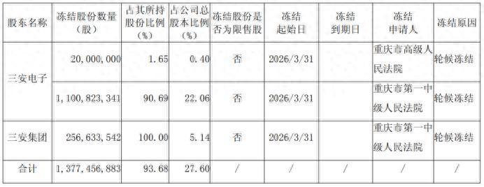 与此同时,三安光电控股股东厦门三安电子有限公司(三安电子)及间接控股股东福建三安集团有限公司(三安集团)持有的股份被司法冻结及轮候冻结,冻结比例合计占公司总股本的27.60%。